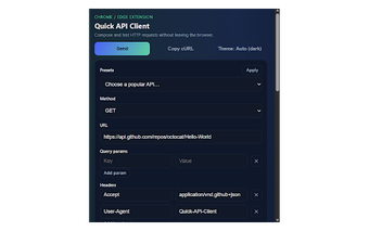 بالإضافة إلى وظائفها الأساسية، يتضمن عميل API السريع ميزات مثل حفظ الإعدادات الافتراضية، التبديل بين الوضعين الفاتح والداكن، والوصول إلى الإعدادات المسبقة المفيدة والتاريخ الأخير لتسريع الاستدعاءات الشائعة لواجهة برمجة التطبيقات. وهذا يجعلها أداة قيمة لأي شخص مشارك في تطوير أو اختبار واجهات برمجة التطبيقات، مما يسمح بتفاعل سلس دون الحاجة إلى التبديل بين تطبيقات مختلفة.